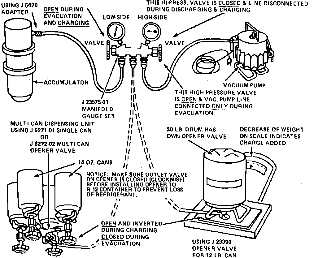 If 14 ounce R-12 cans are used, close tapping valve, then attach cans following instructions included with manifold adaptor.