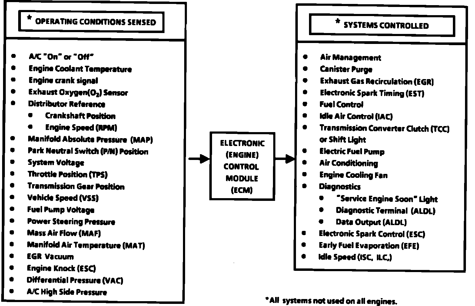The full function system, Fig. 1, operates different control systems, depending upon application, including: fuel control and air management systems, ignition timing, Idle Speed Control (ISC), Exhaust Gas Recirculation (EGR), Early Fuel Evaporation (EFE), Evaporative Emission Control (EEC) and Transmission Converter Clutch (TCC).