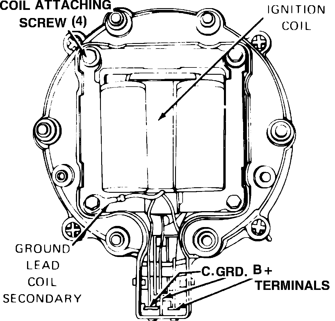 3. Remove coil attaching screws, then remove ignition coil with leads from distributor cap.