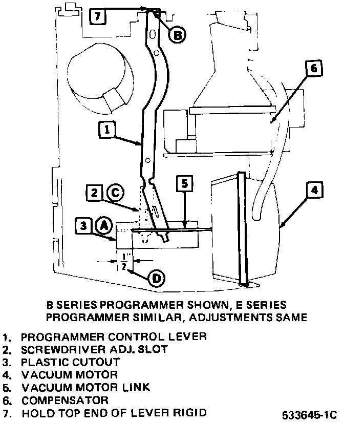 6. Insert a standard flat-bladed screwdriver into the programmer control lever adjusting slot "C" and rotate to move the vacuum motor link as follows: