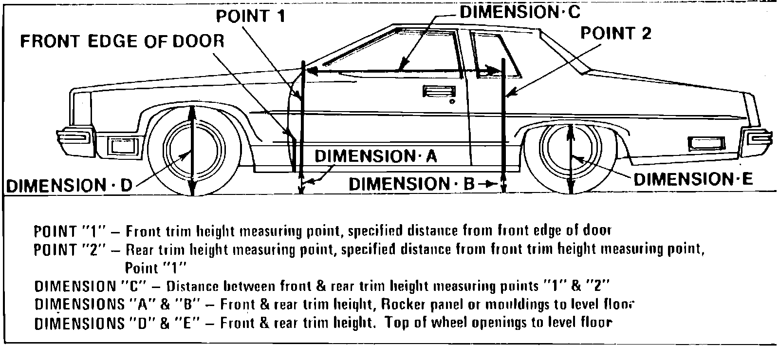 On 1982 Buick exc. Century models, the trim heights are measured from the tops of the wheel openings to a level floor, dimensions ``D'' and ``E,'' Fig. 29. On Buick Century, 1983-85 Buick and all Oldsmobile and Pontiac models, the trim heights are measured from the rocker panel or moldings to a level floor, dimensions ``A'' and ``B,'' Fig. 29. The points at which trim heights are taken are at specified locations along the rocker panel or molding. On all models exc. Century, Cutlass Ciera, 6000 and 1983-85 Buick, point ``1,'' Fig. 29, at which dimension ``A'' is taken, is a specified distance rearward of the front edge of the door. Point ``2,'' Fig. 29, at dimension ``B'' is taken at a specified distance rearward of point ``1,'' dimension ``C.'' Refer to ``Vehicle Trim Height Specification Chart'' at end of chapter. On Century, Cutlass Ciera, 6000, and 1983---85 Buick models, point ``1'' and ``2,'' Fig. 29, are measured at a specific point rearward of the front wheel axle center line or a specific point forward of the rear axle centerline.