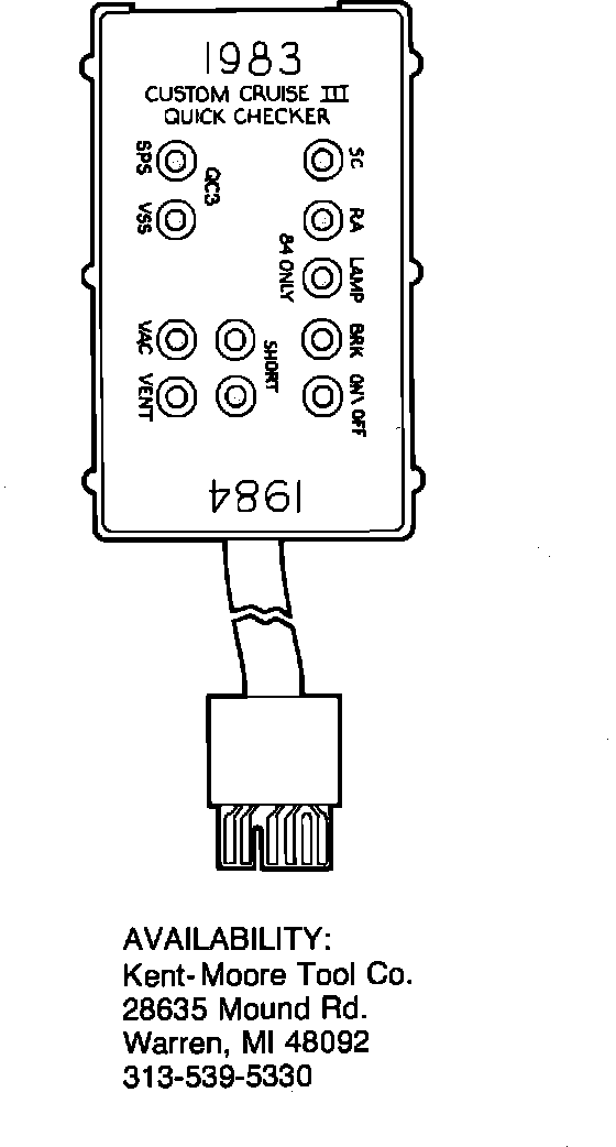 System tester tool No. J-34185, or equivalent can be used to diagnose system malfunctions. The tester replaces the electronic cruise controller (module) in the system and is used to isolate defective components. Use of a tester is highly recommended. Follow tool manufacturers testing procedures and cautions.