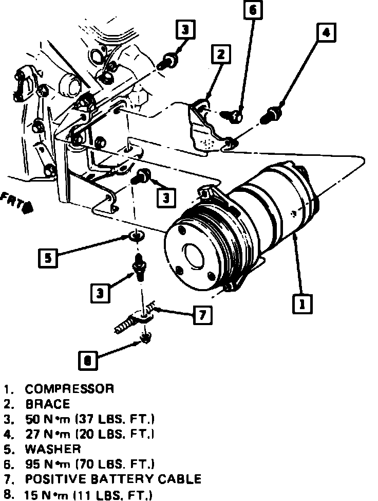 6. Remove splash shield, then compressor adjusting bolts and belt.