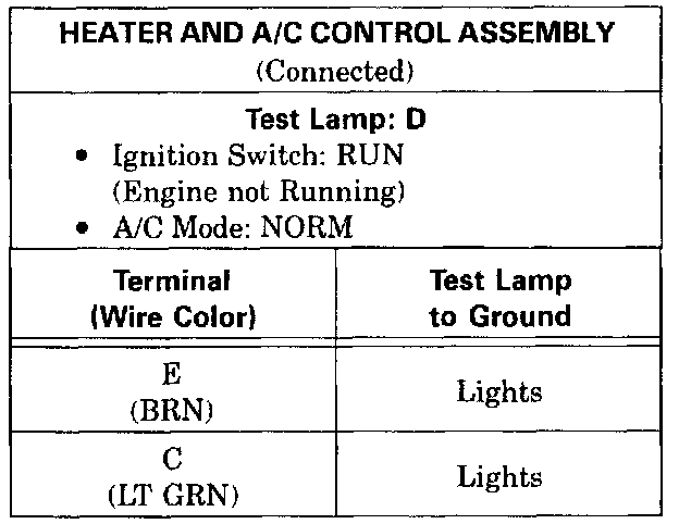 ^ If test lamp does not light at Terminal C, replace the Heater and A/C Control Assembly.