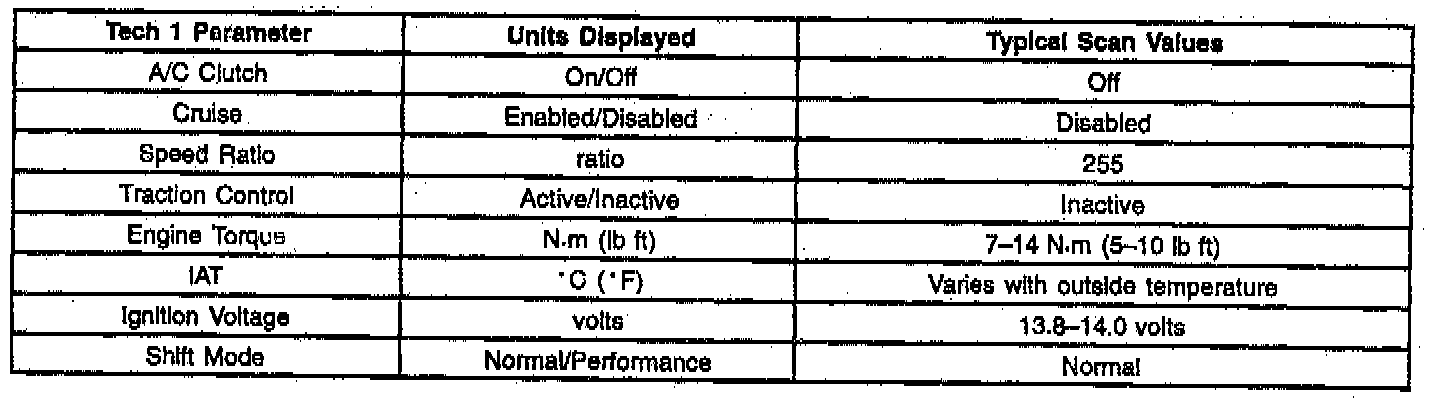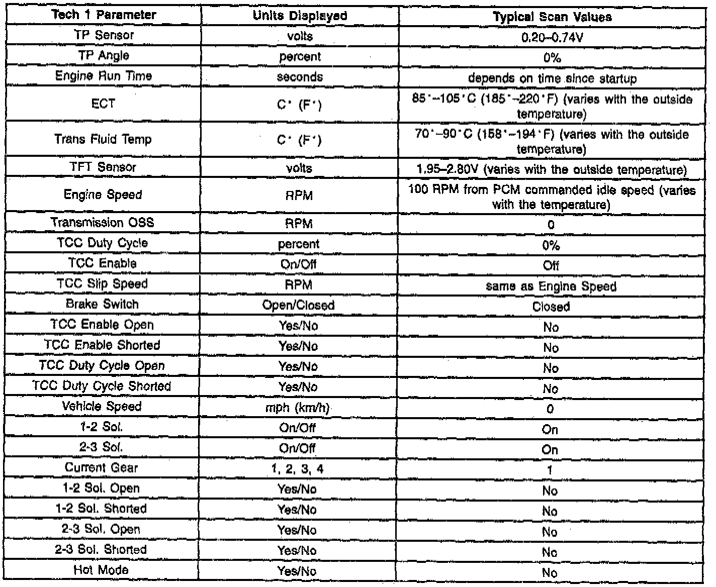 If you have completed the On-Board Diagnostic (OBD) system check, if the diagnostics are functioning properly and if no DTCs display, you may use the typical scan values in the table below for comparison within the appropriate transmission. These typical values are an average of display values recorded from nominally operating vehicles. They represent the display from a normally functioning system.