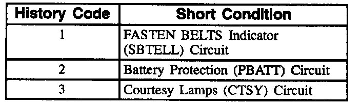 Upon entering the Diagnostic Mode, the MALL module provides audible feedback in the form of bongs; the number of bongs represents the stored history code number. The FASTEN BELTS indicator flashes with each bong. The history code and its corresponding short circuit condition are as shown in the figure.