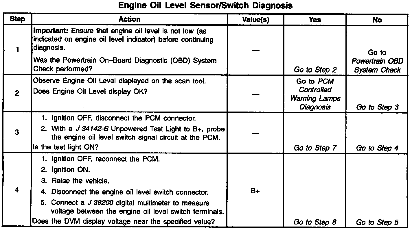 ^ Poor connection at PCM or oil level sensor. Inspect harness connectors for backed out terminals. Improper mating, broken locks, improperly formed or damaged terminals, and poor terminal to wire connection.