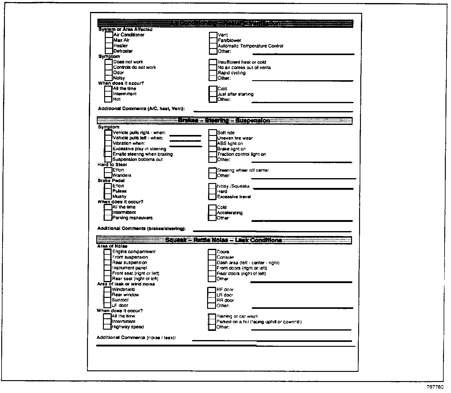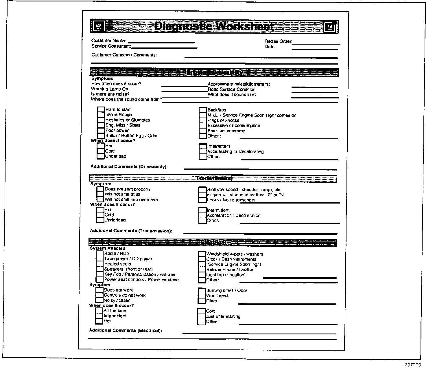 During the last several years, we have made great strides in the quality of services we deliver to our customers. Customer satisfaction levels are increasing, but as these levels go up, so do our customers' expectations. In order to remain competitive and retain our valuable customers in the future, we will have to keep improving customer satisfaction. The key to future improvement will be enhancing communications with our customers. One of the most challenging aspects of our business is to communicate the concern from the customer to the technician. The more clearly the technician understands the concern and its symptoms, the more likely the problem will be fixed right the first time." With that in mind, there has never been a better time to revitalize the use of a diagnostic worksheet. GM Service Operations is releasing a revised diagnostic worksheet based on input from GM Technical Assistance, Service Engineers, Service Manual Writers and a select group of retail Dealer Service Directors. The new diagnostic aid, streamlined to a single sheet, reflects today's product without sacrificing content. Dealers/retailers report they are very helpful in reducing shop comebacks, increasing technician productivity and producing satisfied customers. Here are a few of the many benefits gained from using the worksheets: