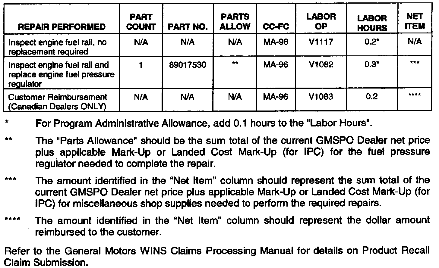 Customer requests for reimbursement of previously paid repairs to replace the engine fuel pressure regulator, or replace the upper intake manifold and related repairs due to a ruptured manifold that were performed prior to this notification, are to be submitted by August 31, 2005.