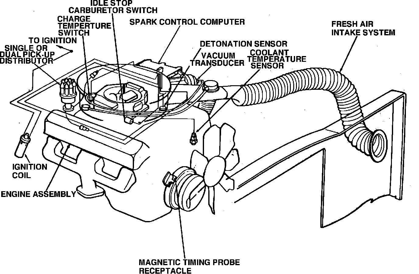 The Electronic Feedback Carburetor System works in conjunction with the Electronic Spark Control System, Fig. 1, and controls emissions by close regulation of the ignition timing and air/fuel ratios. The precise control of the air/fuel mixture permits the use of a three-way catalyst which simultaneously reduces all three major exhaust pollutants: hydrocarbons (HC), carbon monoxide (CO) and oxides of nitrogen (NOx) into harmless substances. Two modes of operation of this system are the Open Loop and the Closed Loop.