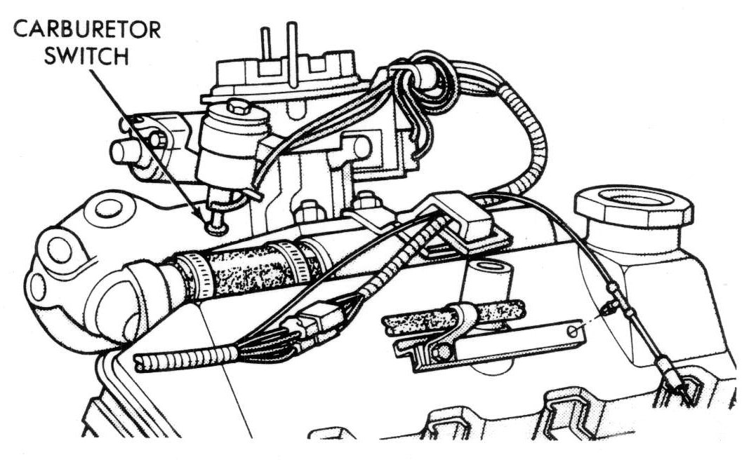 6. On vehicles equipped with a carburetor switch, connect a jumper wire between the carburetor switch and ground. Disconnect and plug the vacuum line at the Spark Control Computer.