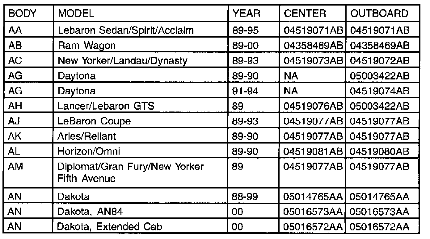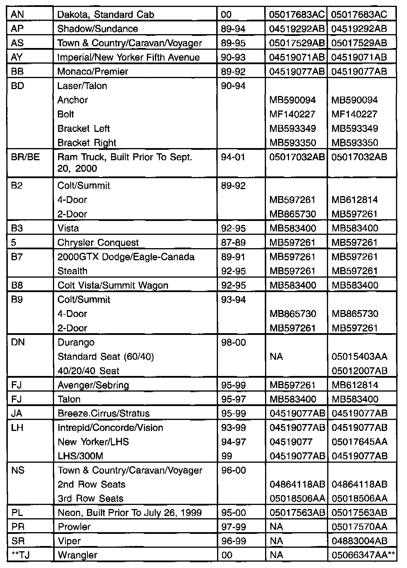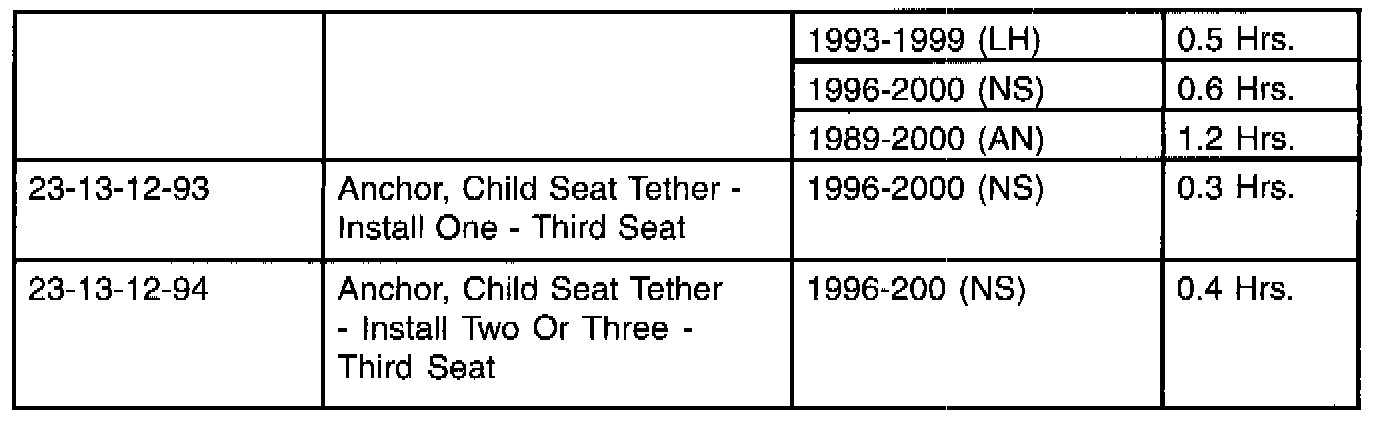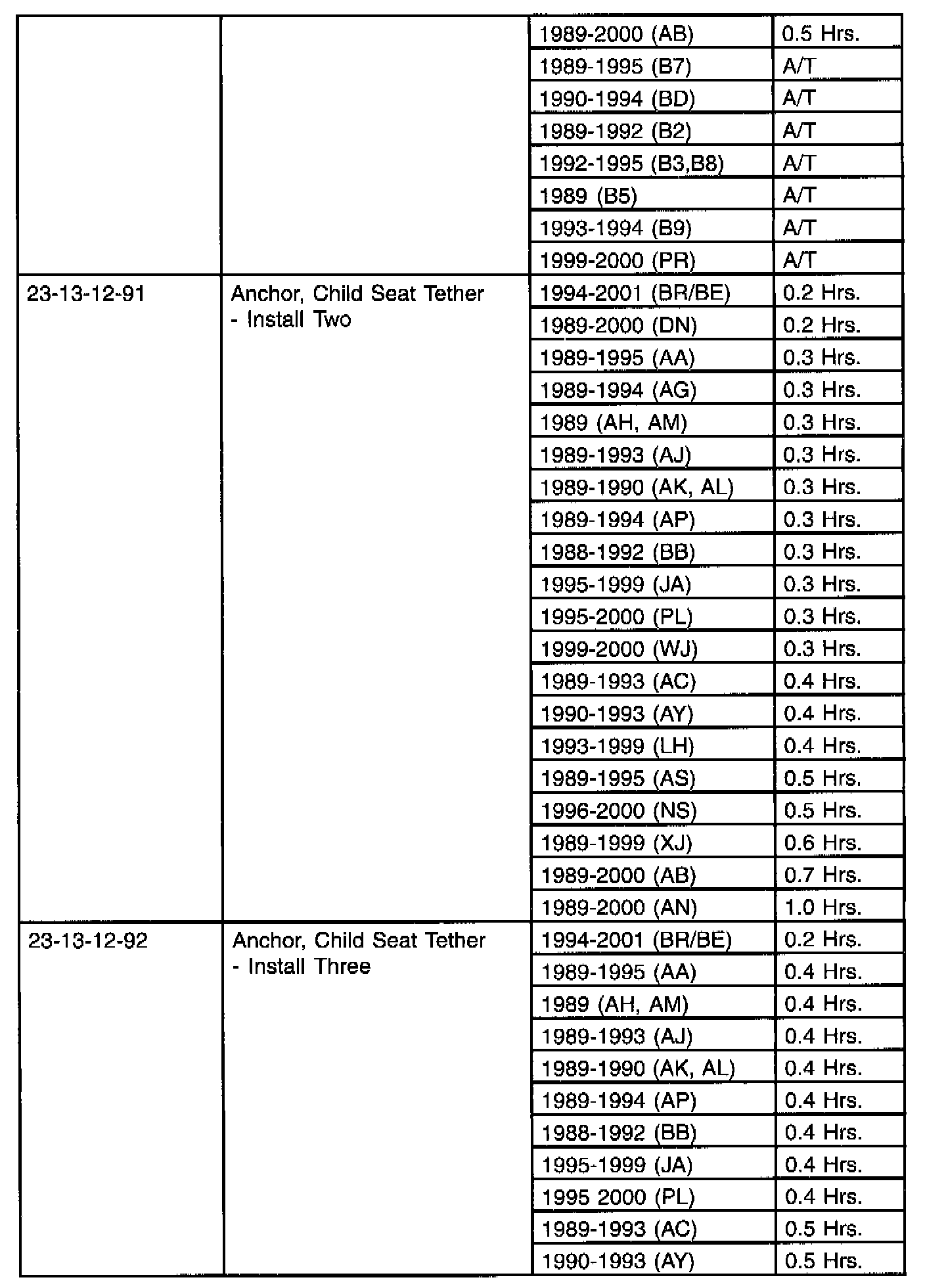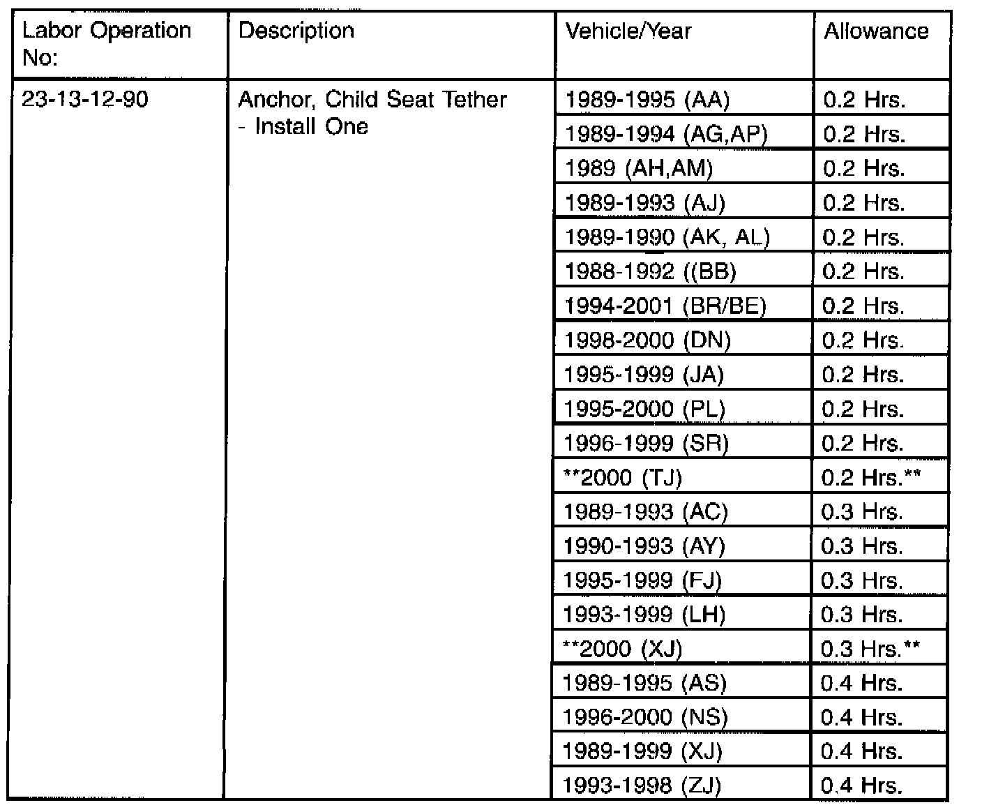 THIS BULLETIN IS PROVIDED TO IDENTIFY THE PARTS AND LABOR OPERATION NUMBERS NECESSARY TO INSTALL A CHILD SEAT TETHER ANCHOR. DAIMLERCHRYSLER WILL REIMBURSE YOU FOR THE ANCHORS AND LABOR TO INSTALL THEM. THIS IS BEING DONE IN THE INTEREST OF CUSTOMER SATISFACTION. REFER TO GLOBAL WARRANTY ADMINISTRATION BULLETIN # D-99-23 FOR COMPLETE REIMBURSEMENT INSTRUCTIONS.