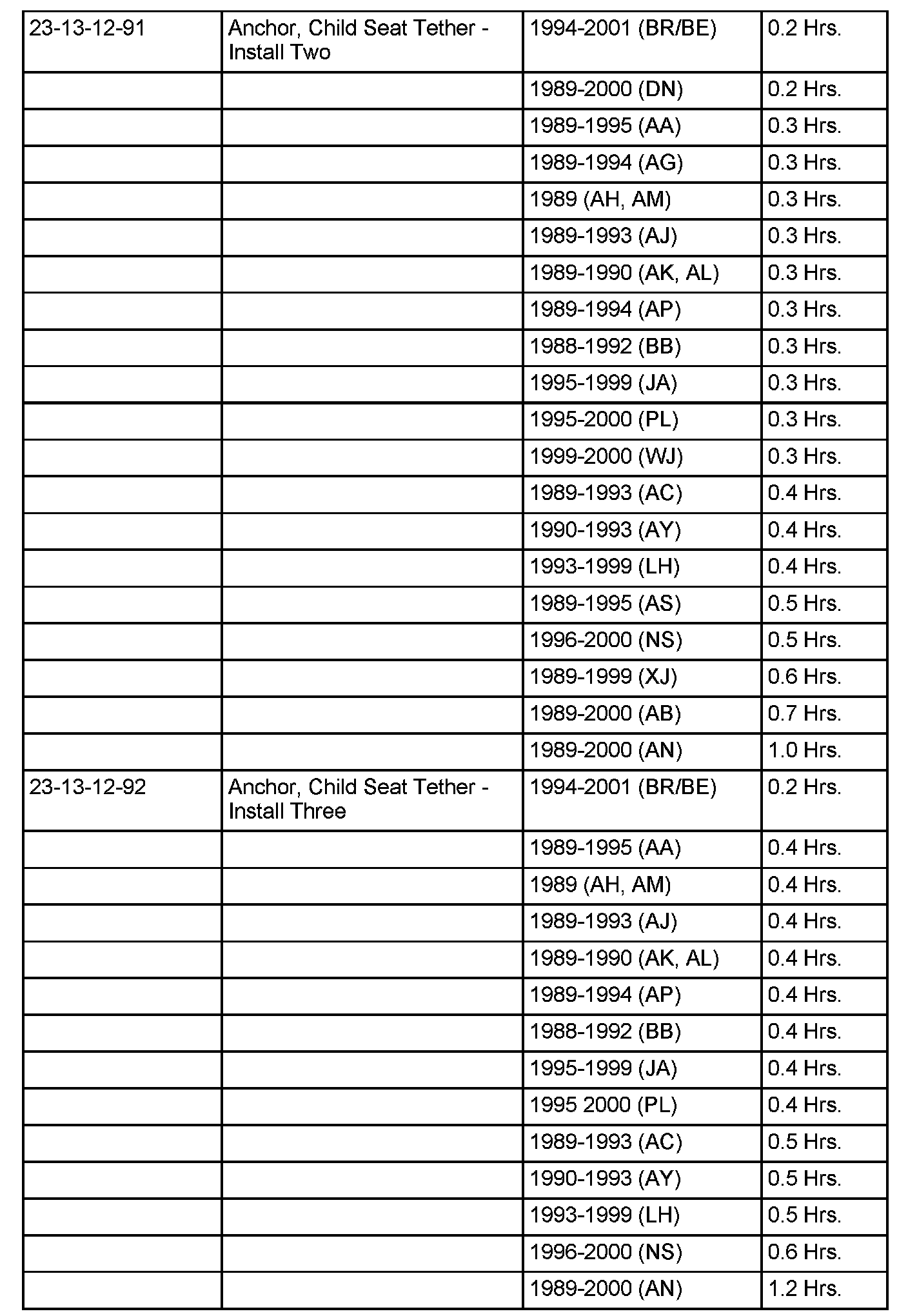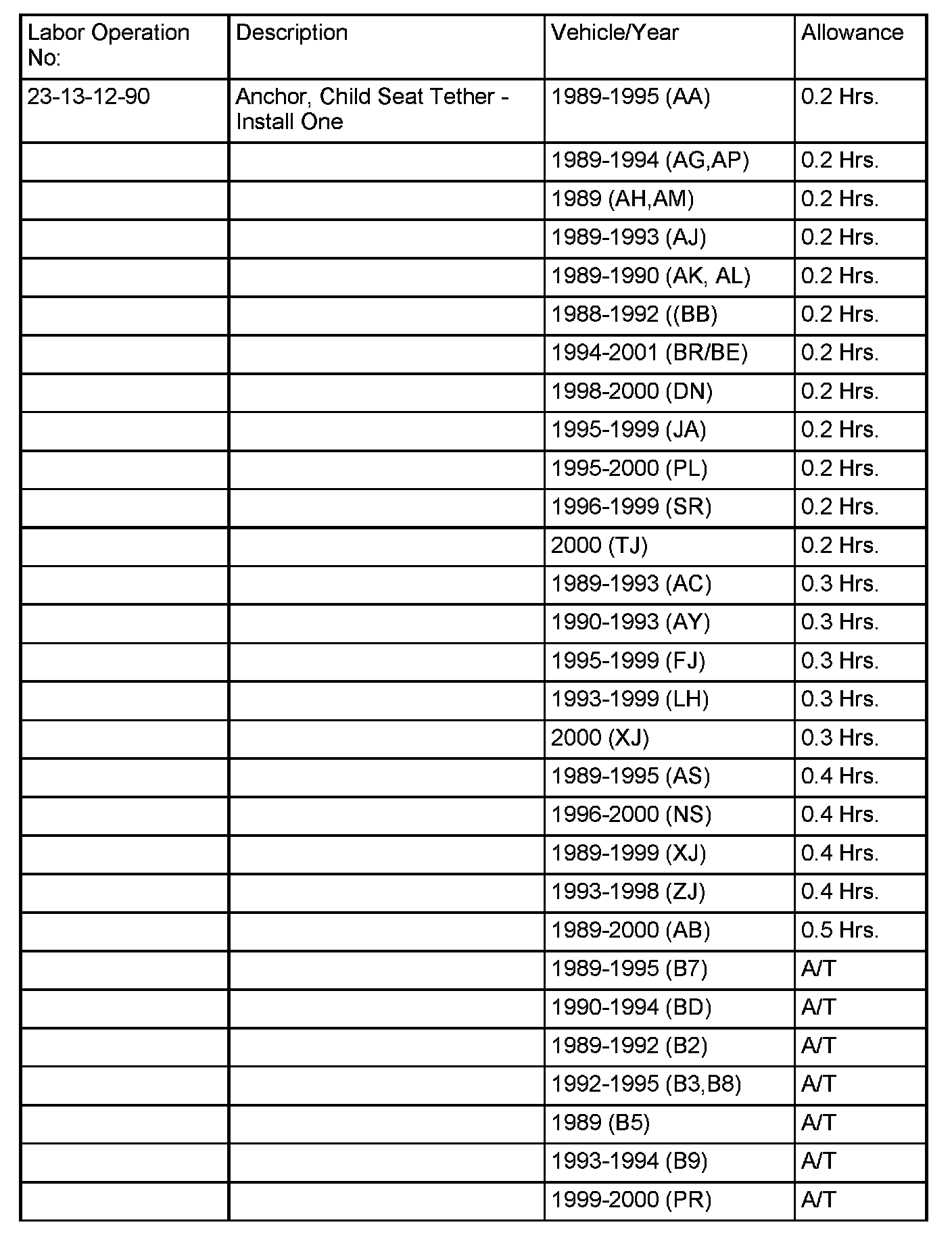 This bulletin is provided to identify the parts and labor operation numbers necessary to install a Child Seat Tether Anchor. Each dealer is encouraged to install these kits based on customer request and Chrysler will reimburse any Chrysler / Dodge / or Jeep dealer installing these kits regardless of vehicle age or mileage.