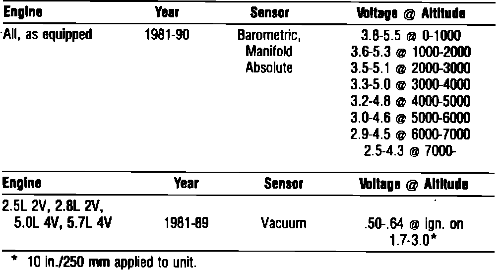 Manifold Absolute Pressure Sensors: Messure voltage with ignition on and engine off. Start engine and apply 10 in./250 mm Hg to unit, voltage should be 1.2-2.3 volts less.