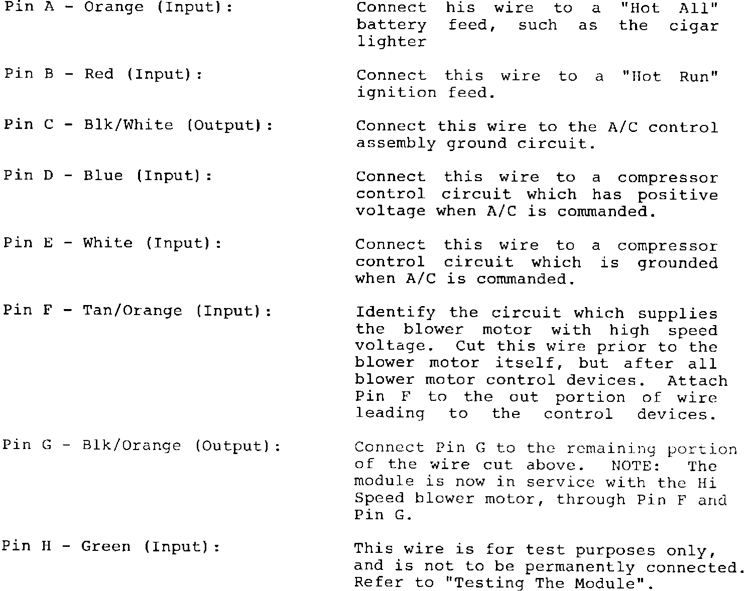 Each afterblow module (P/N # 25533406) is shipped with an instruction sheet. It contains limited instructions for specific systems as well as a Pin/Wire Color reference chart. The requirements for each pin are as follows: