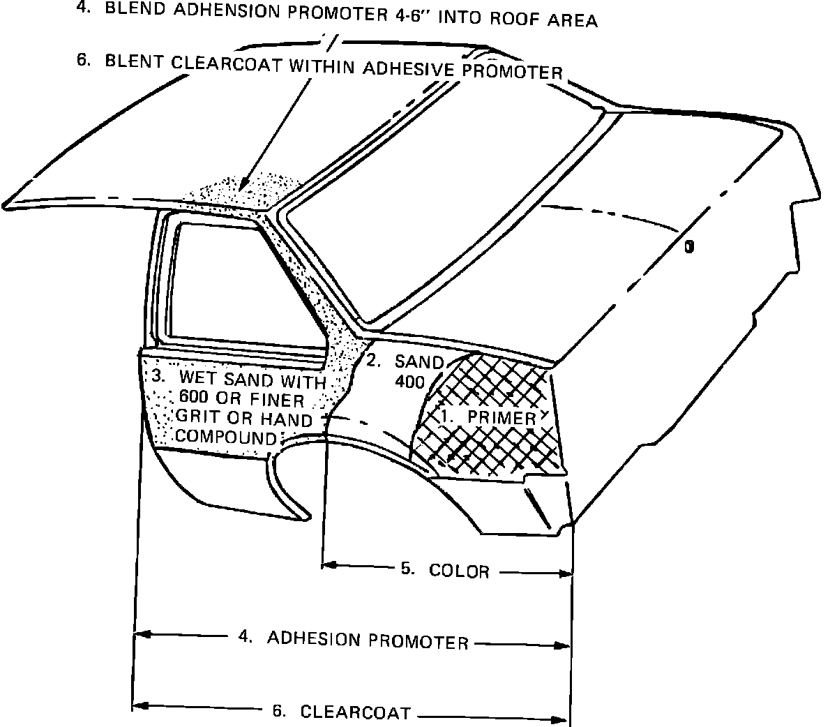 FIGURE 2 - TYPICAL FULL PANEL REPAIR WITH LACQUER OR ENAMEL CLEARCOAT: