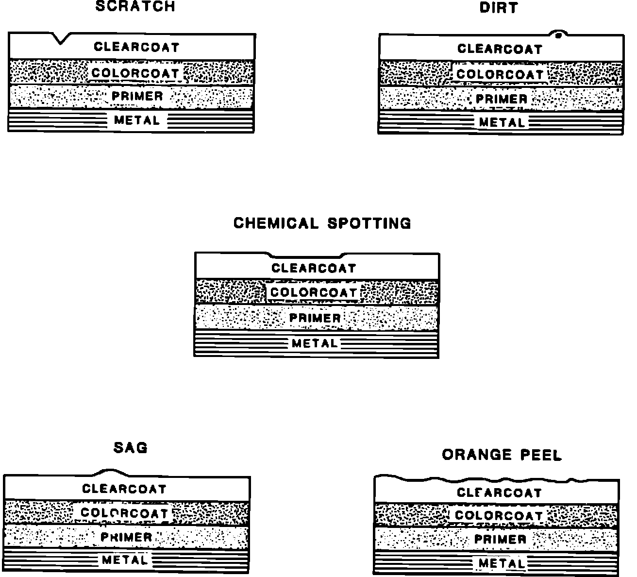 Many minor paint imperfections such as scratches, dirt, chemical spotting, sags and orange peel can be repaired without repainting (see Figure 1).. If an imperfection can be sanded out before reaching the colorcoat on vehicles having a clearcoat, there is no need to repaint.