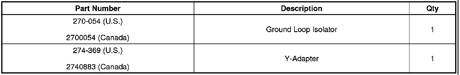 - Have the customer purchase a Ground Loop Isolator, such as *Radio Shack Catalog #270-054. This device plugs in between the radio and the customer's audio device. It is packed with one included Y-Adapter. If purchasing the *Radio Shack product, you will require an additional Y-Adapter (Catalog #274-369). This device should be installed between the audio player and the AUX input of the vehicle radio. These catalog numbers are stocked nationally at *Radio Shack Retail Stores in the U.S. and are currently available. Other similar products are available through other electronics or car stereo retailers defined as Ground Loop Isolators.