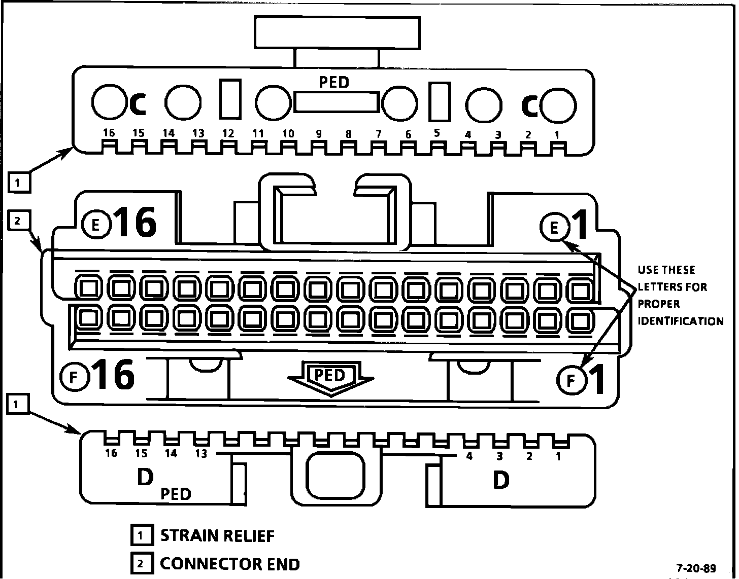 Currently a common strain relief is used in both the C-D 32 pin and the E-F 32 pin connector. To properly identify these connectors, the strain reliefs must be removed. Use the lettering on the connector as shown on the attached document.