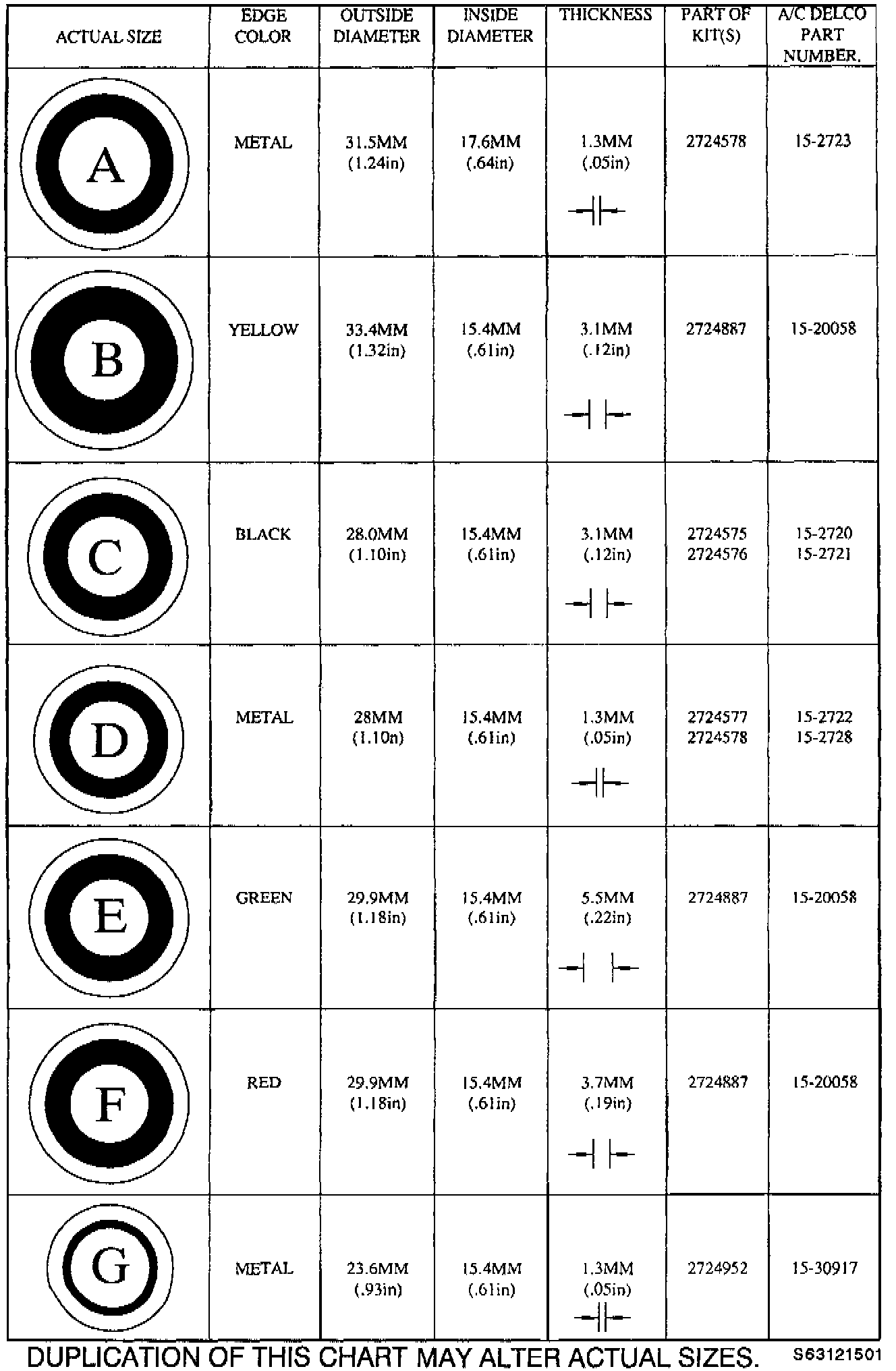 The chart shown will help to properly identify the seals. Use the chart by placing the seal over the pictured seal to identity inside and outside diameters and thickness. Because these seals are very similar in size, specifications are also listed in the chart.