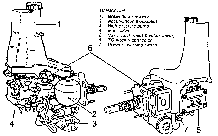 The main components of the hydraulic unit, Fig. 2, are the brake fluid reservoir, fluid level switch, accumulator and a pressure warning switch.