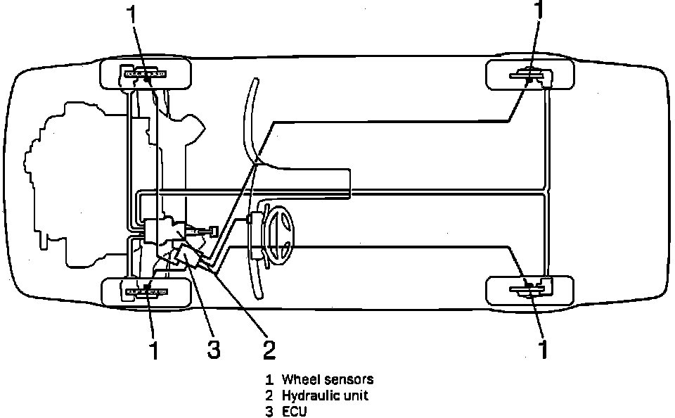 This Anti-Lock Brake System (ABS) Fig. 1, is a triple-circuit system, with split circuits and individual monitoring and control for each front wheel and for the two rear wheels together.