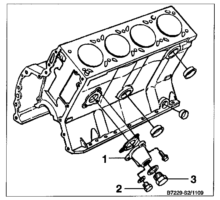 3. Remove the engine block drain plug (2). The drain plug is located behind the exhaust manifold. Do not remove cover (1) or plug (3).