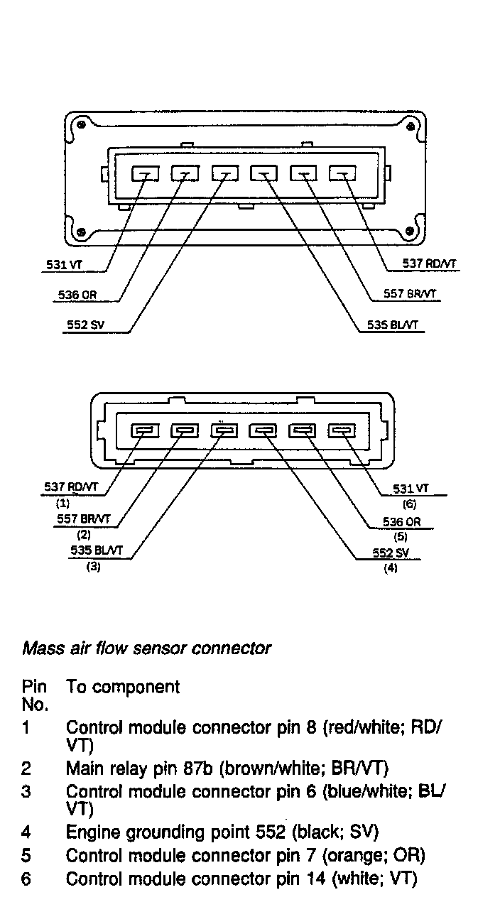 5. If nothing happens, check the red/white (RD/VT) lead between pin 1 of the mass air flow sensor connector and pin 8 of the control module connector, and the black (SV) lead between pin 4 of the mass air flow sensor connector and one of the engine grounding points. If the wiring is OK, test the system using a different control module.