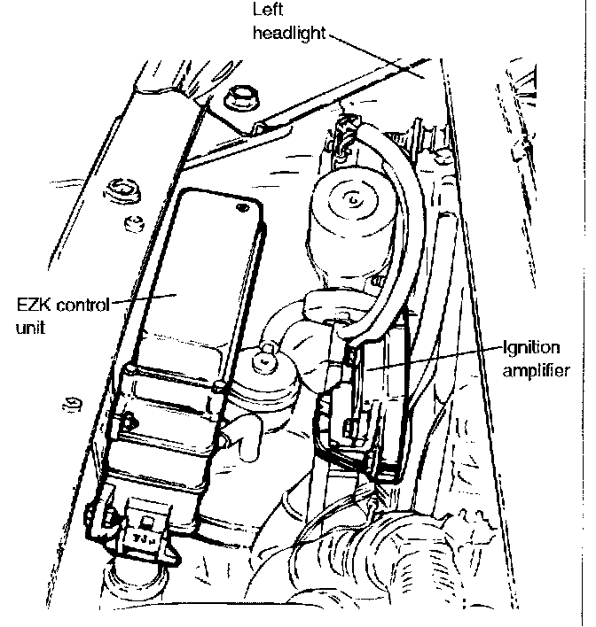 Unplug the connector from the EZK control unit and connect a voltmeter (VDC scale) between terminal 6 (+) and 20 (-) of the connector. With the ignition on, there should be battery voltage. Turn the ignition oft and reconnect the connector. If no faults are found proceed to the next step. If voltage is not present, use the wiring diagrams to check for wiring faults.