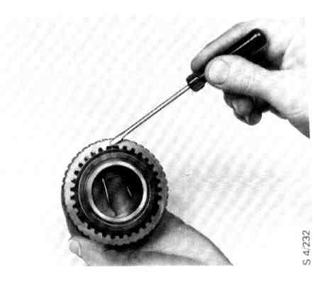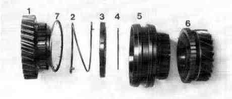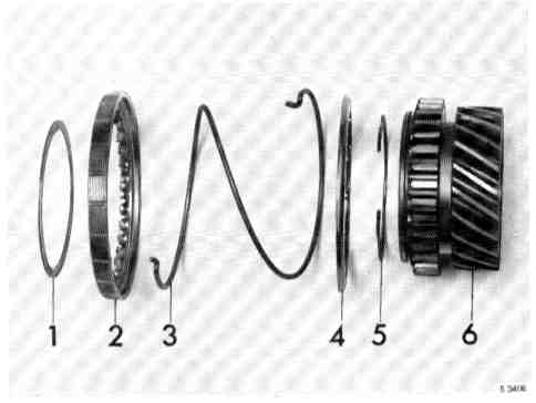 First fit the guide ring for the springs and the circlips for the 3rd and 4th gearwheel guide rings. The 1st and 2nd gearwheels have no circlips for the guide rings. Fit the spring with the long end towards the guide ring and locate it so that there are eleven teeth between the spring ends. Locate the baulk ring so that the ends of the spring are between the teeth of the baulk ring and then fit the circlip.