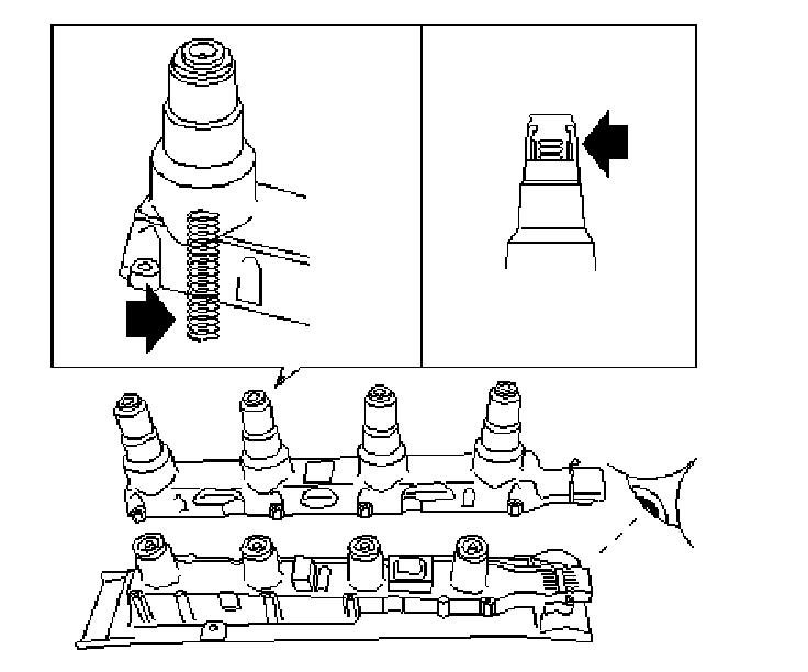^ Position the ignition discharge module so that the spark plugs are inclined downwards and the oil in the ignition coils covers the HT outputs.