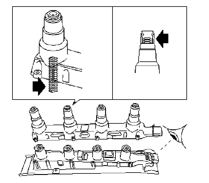 ^ Position the ignition discharge module so that the spark plugs are inclined downwards and the oil in the ignition coils covers the HT outputs.