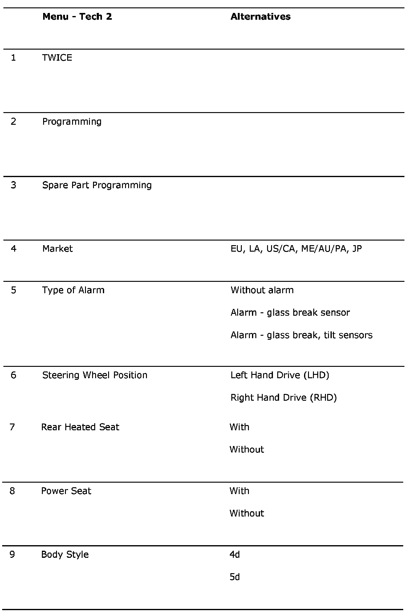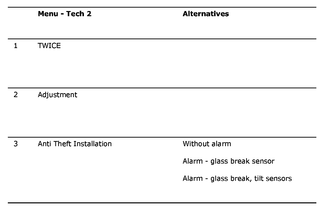 The anti-theft protection function is controlled by TWICE, which is programmed from the control module supplier. However, this basic programming cannot satisfy the requirements of all markets (countries) and additional programming may be needed during manufacture of the car. This is called "Factory programming".