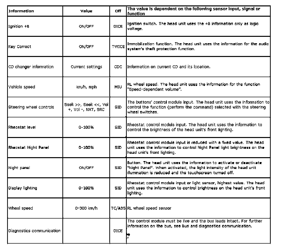 The head unit uses the following information