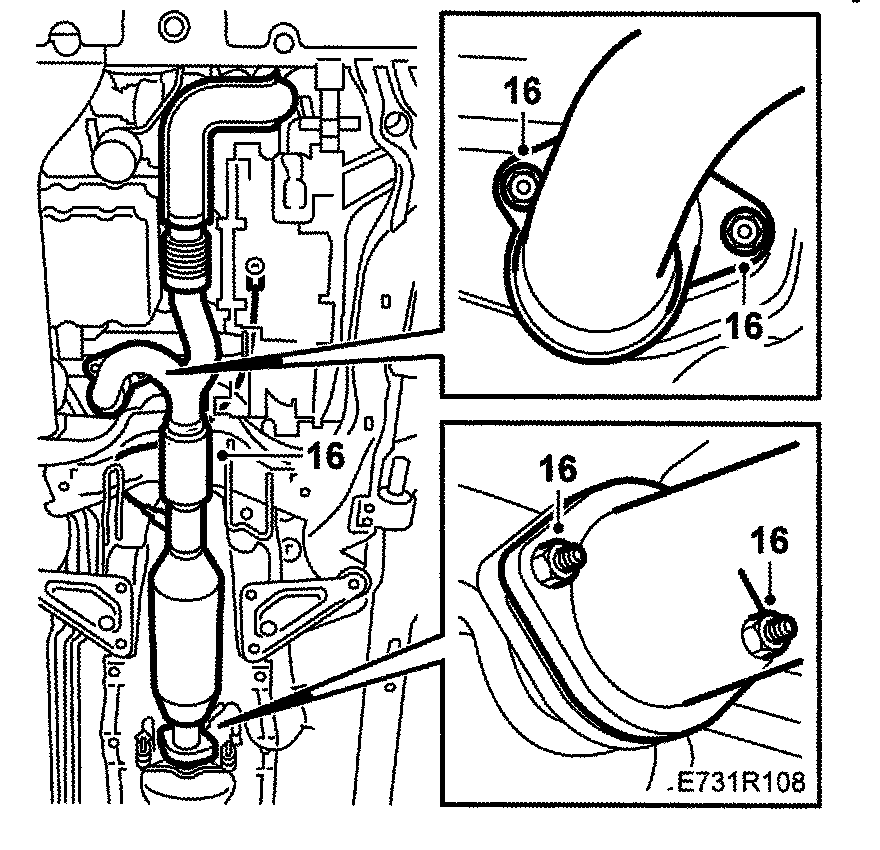 22. R4: Lift up the front part of the exhaust pipe and tighten the joint between the catalytic converter and silencer and the connection to the turbocharger.