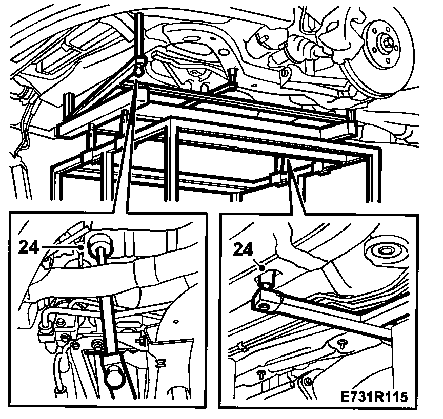 24. Place 83 95 311 Lifting trolley with 83 94 801 Parent fixture, intermediate stay 83 95 170, basic fixture 83 95 188and jig 83 95 196 underneath and remove the remaining subframe retaining bolts.