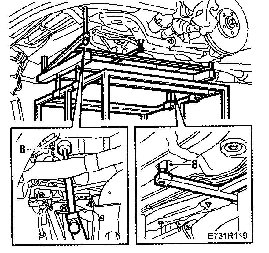 9. Fit the bolts to secure the subframe and the rear support plates. Tighten the bolts just enough so that the subframe does not move out of its position when the lifting trolley and fixture are removed.