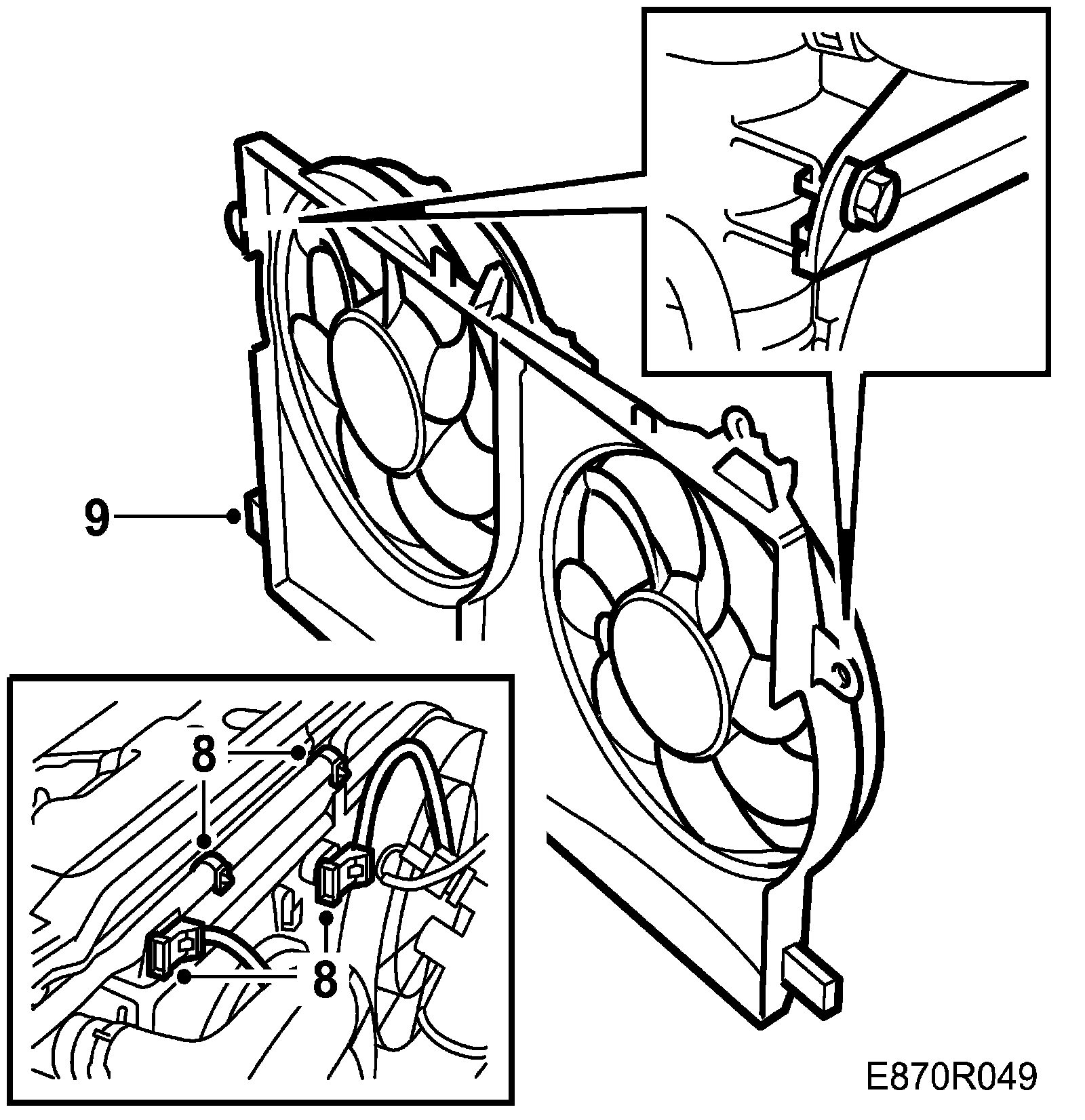 9. Fit the fan cowling, 2 locating grooves and 2 bolts.