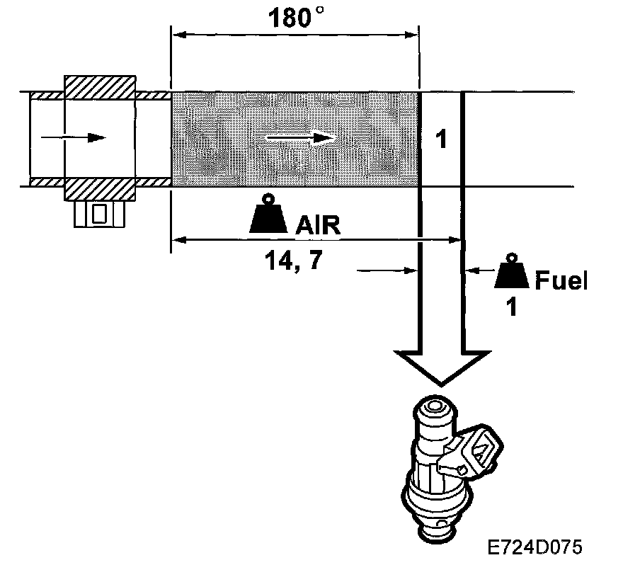 To attain lambda 1, the fuel/air ratio must be 1 kg fuel to 14.7 kg air. Since we know the amount of air being drawn into each cylinder/combustion, the control module can easily calculate how much fuel to inject into the cylinders on each occasion. Milligrams air/combustion is divided by 14.7 and the result is the amount of petrol to be injected in mg/combustion.