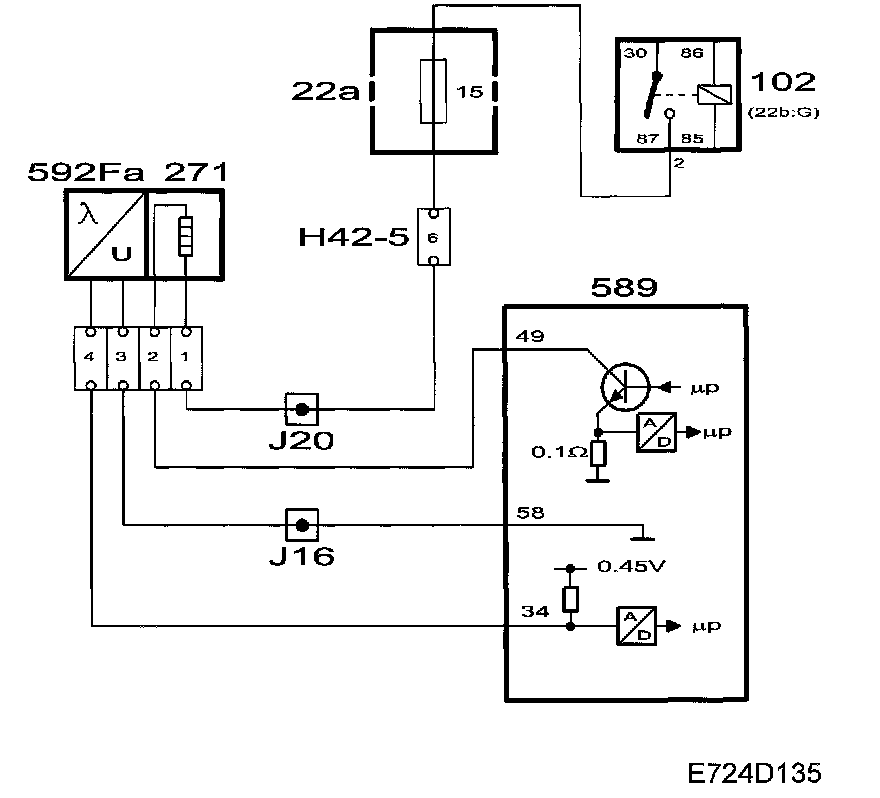 To be able to quickly supply voltage after starting, the oxygen sensor must be preheated.Preheating is fed with B+ from the fuel pump relay via fuse 15 and is grounded via control module pin 49. To be able to regulate the preheating, the grounding of the preheating circuit is pulse width
