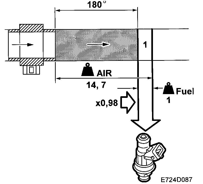 The basic fuel quantity has been calculated to give the air/fuel ratio 14.7:1. The calculation is based on the value from the mass air flow sensor. Air leaks and tolerances in the mass air flow sensor can affect the calculation. When the fuel quantity is subsequently converted to injection duration, the control module assumes that the flow through the injectors is faultless. Tolerances in the injectors and variations in the fuel pressure can affect the calculation.