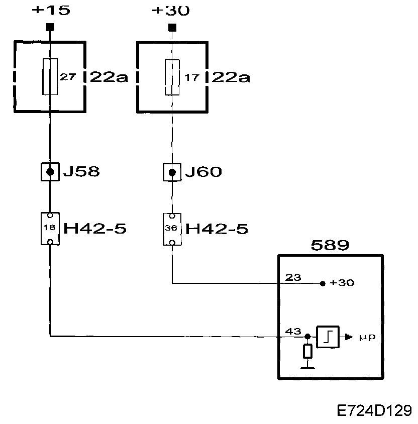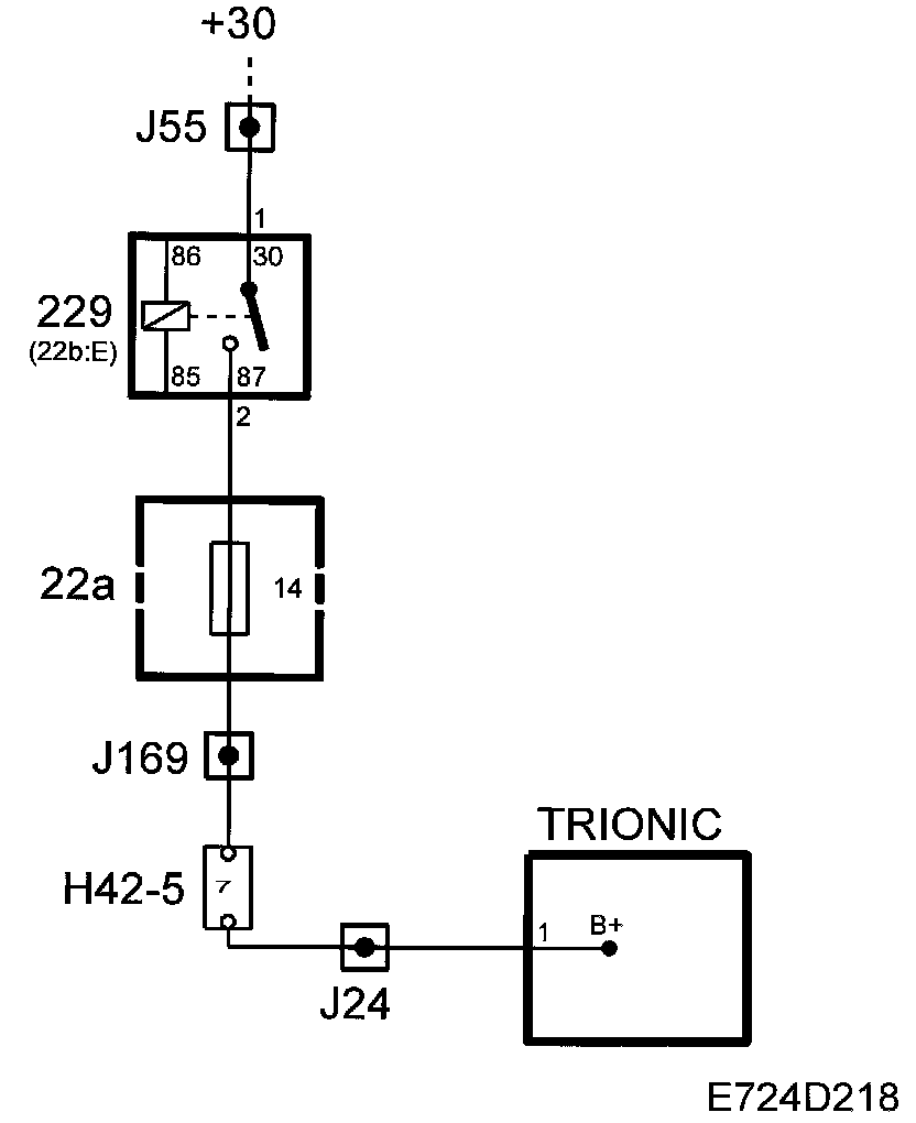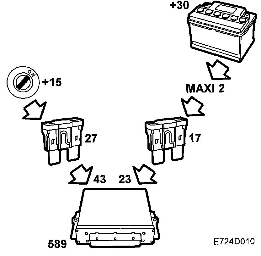 The main relay, fuel pump relay and fuse 17 are supplied with +30 from maxi fuse 2. Control module pin 23 is supplied from fuse 17.