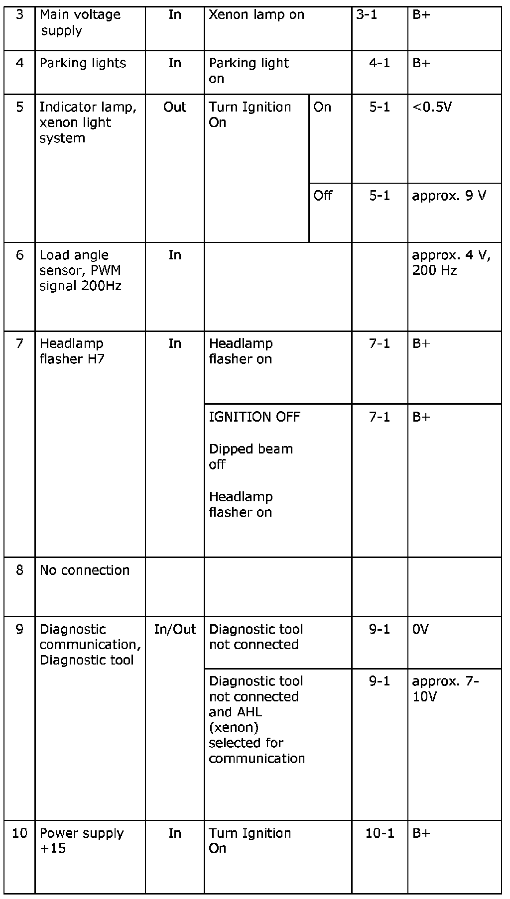 Readings, Control Module Connections, Xenon Headlamps