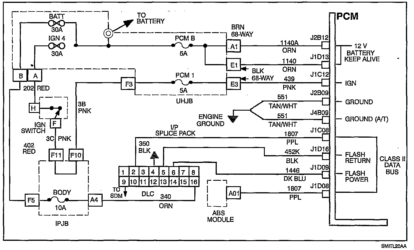 The class II data bus is used by the PCM as well as ABS (if equipped). The Scan tool communicates to both controllers through pin 2 of the DLC connector. The Scan tool also uses pin 4 (circuit 350) of the DLC as a ground reference when reading serial data. The class II data bus is normally around 0.5 volts and is switched high (seven volts) to low when communications are taking place.