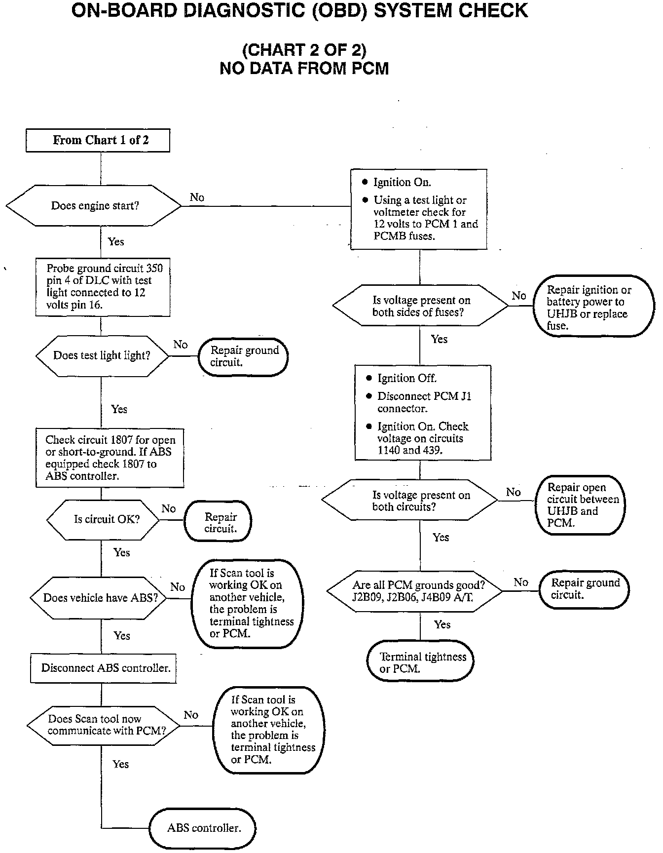 If a Scan tool cannot communicate with the PCM, chart 2 of 2 will isolate the cause. If the engine starts and runs OK it indicates the PCM is functional and the problem is in the serial data link.