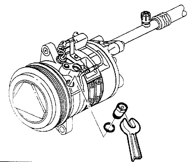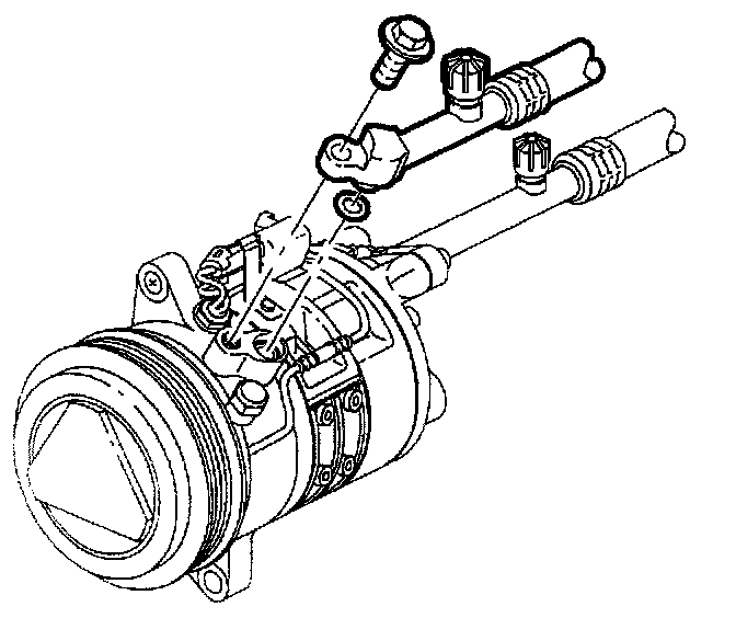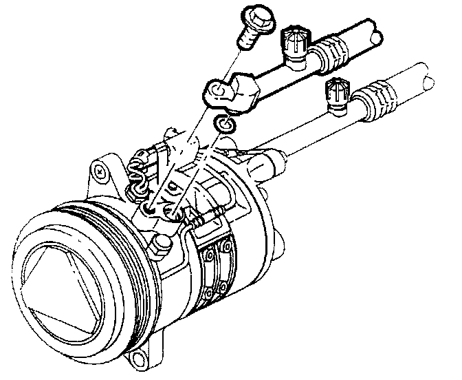 2. Lubricate and install new O-ring on discharge hose with R-12 mineral oil. Install high side hose to compressor high side port. Torque to specification.