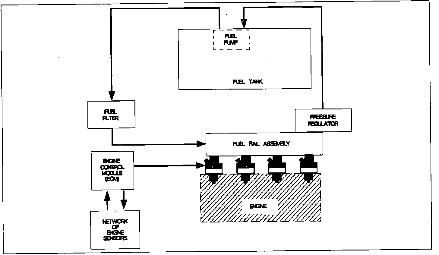 The fuel is delivered to the fuel rail and circulated through the system by an in-tank fuel pump. The fuel gage sending unit is mounted on the side of the pump module. Fuel is pumped through a fuel supply line to an in-line fuel filter. A pressure regulator on the fuel rail keeps the fuel pressure at the fuel injector between 214-306 kPa (31-44 psi) depending on intake manifold vacuum. Excess fuel not needed by the fuel injectors is returned to the fuel tank by a separate line. The fuel pump is controlled by the PCM through the fuel pump relay.