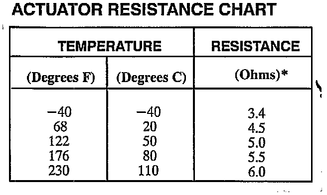 *These values may vary slightly. When an actuator is suspected to be causing a problem, an accurate way of checking resistance is to compare the suspect actuator value to the resistance value of the other actuators. Values should be within one ohm of each other.