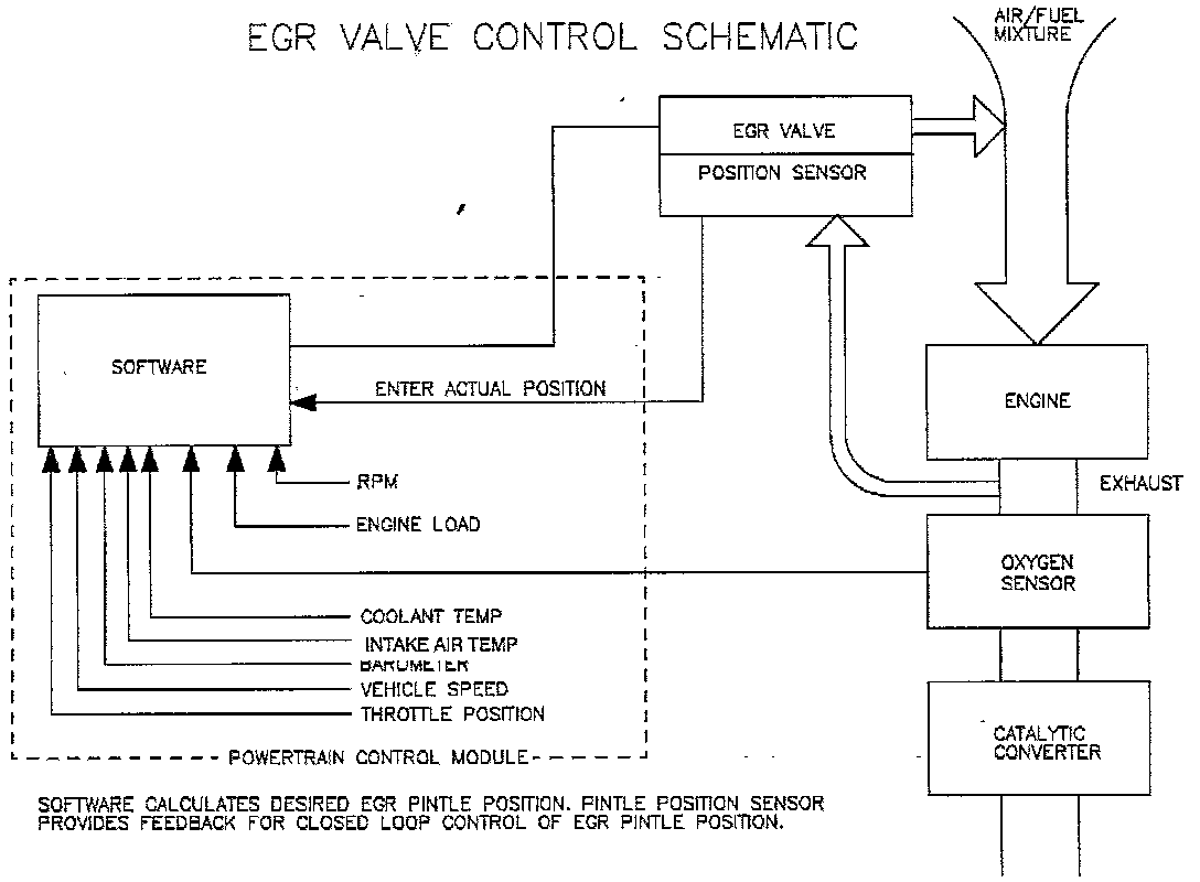 The linear EGR valve also contains a position feedback circuit which provides a variable voltage (0-5 volts) signal back to the PCM. This signal provides for the control of EGR to be a closed loop system because the actual position of the EGR pintle can be communicated back to the PCM so that corrections can be made. Fuel and spark compensation for EGR are determined from actual EGR position.