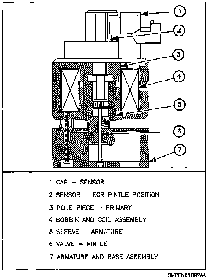 The exhaust gas then flows from the cylinder head exhaust port (through the orifice) to the intake manifold. The height of the pintle is read by the pintle position sensor, and the control module closes the loop as desired position versus actual position read, changing the pulse width modulated command to the solenoid accordingly, until the actual pintle position equals the desired pintle position.
